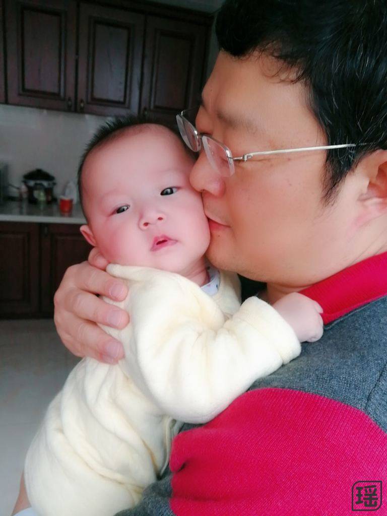 早晨起床就跟爸爸亲的很。称了一下体重,7.7公斤。上次在南京检查时体重是6.7公斤,长了近2斤。