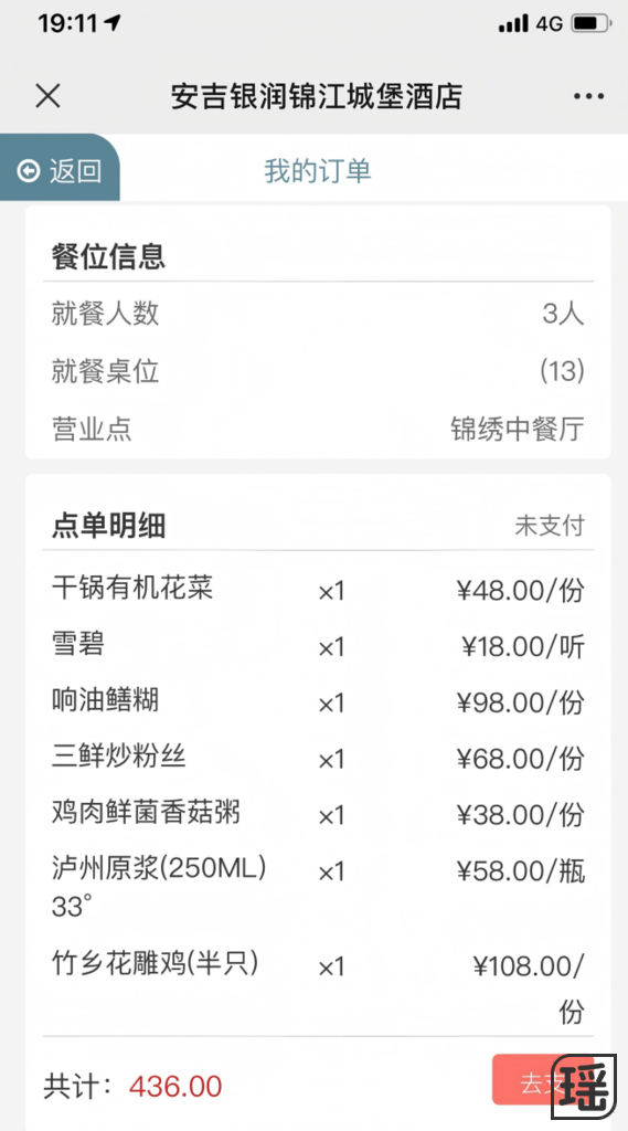 这是晚餐的账单,每次出去都要在住宿的酒店吃一顿。