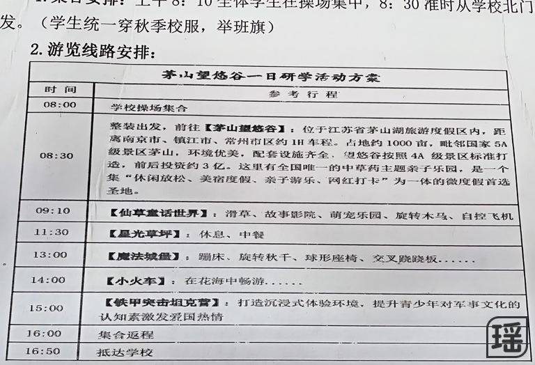 您好!为丰富学生的生活,培养学生的劳动实践能力及创新精神,经学校研究决定,将于2024年11月13日组织二年级全体学生到茅山望悠谷开展“向阳生向善行”研学实践活动。现将具体事宜告知如下: