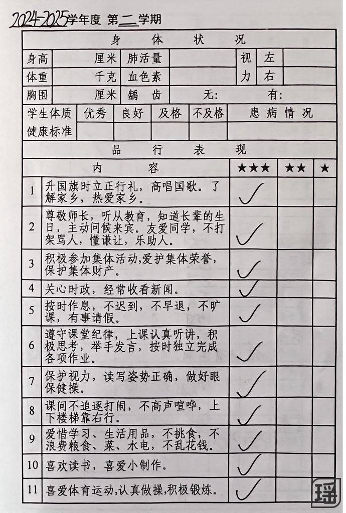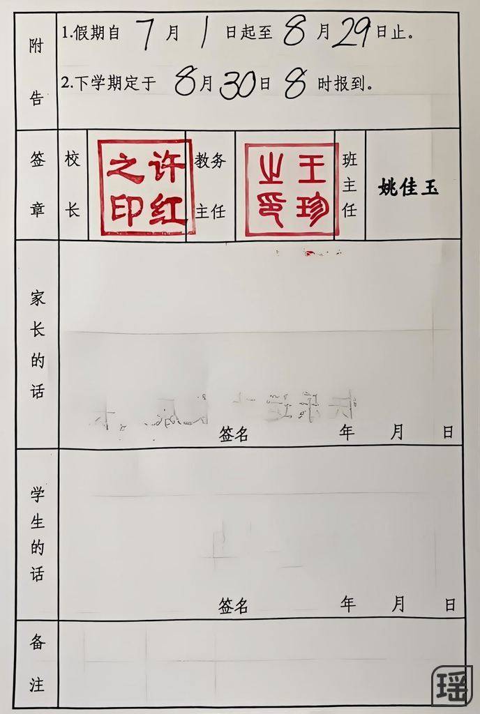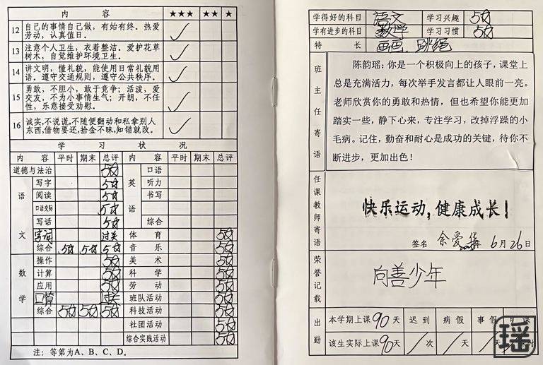 6月23日考试结束,休息一天。25日上午我们就去草原旅游,所以散学典没有参加。报告单请余老师带给干爸,转交给我们。